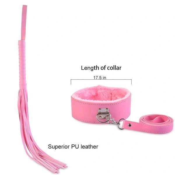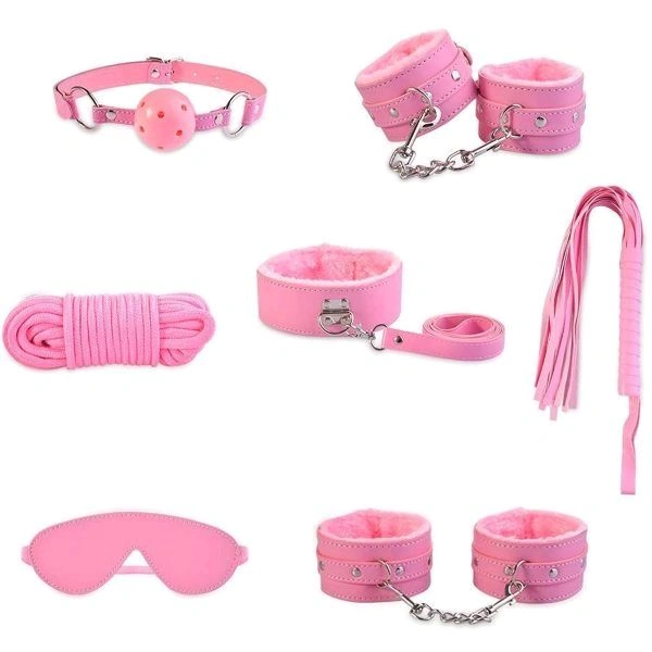 7 Piece Faux-Leather Bondage Kit including Wrist Cuffs, Ankle Cuffs, Collar & Leash,  Breathable Ball Gag Bondage Rope, Eye Mask / Blindfold, and Flogger Whip.