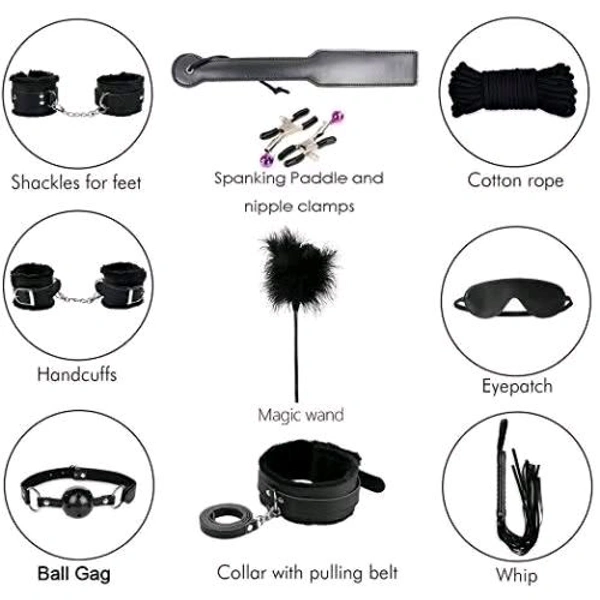 MULTIFUNCTIONAL KIT — This bag includes a whip, rope, eyes patch, kerchief, handcuffs, foot cuffs, wand, spanking paddle, tit clamps, and a ball gag. Use these to attain a distinct purpose once you play along with your sexual partner.